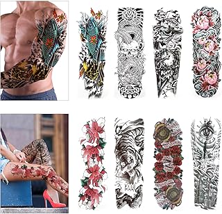 Konsait Tatouage temporaire pour homme femmes, Manchette tatouage Tattoo noir body tattoo Sticker bras Tatouages éphémères, Lion, crâne mort, dragon, Carpe, rose (8 feuilles)
