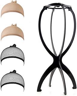 ISKYBOB 4 Pièces Bonnet de Perruque Respirant Beige Noir, Capuchons en Nylon Casquettes de Filet à Cheveux Postiches Tissé pour Hommes et Femmes, avec 1 Présentoir de Perruque Gratuit